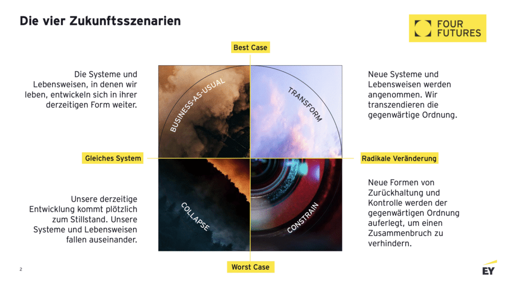 Der DLC hatte die Gelegenheit, mit Mitgliedern Einblicke in das außergewöhnliche Format EY Four Futures – Vier Zukunftsszenarien zu gewinnen. Die Experience basiert nicht auf frei erfundenem Storytelling, sondern auf wissenschaftlichen Studien und fundierten Szenarien, die als Grundlage für vier mögliche Zukunftsbilder im Jahr 2055 dienen.